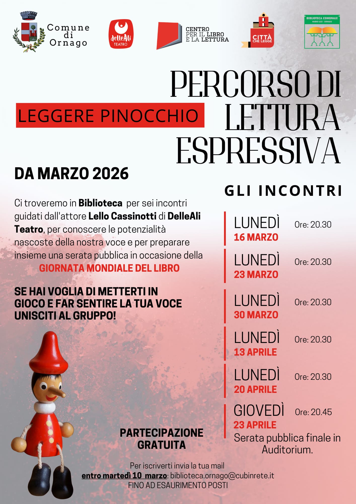 In occasione della Giornata Mondiale del Libro, il Comune di Ornago, in collaborazione con la Biblioteca Comunale "Mario Luzi" organizza, all'interno del bando "Città che legge", un percorso di lettura espressiva articolato in sei incontri.