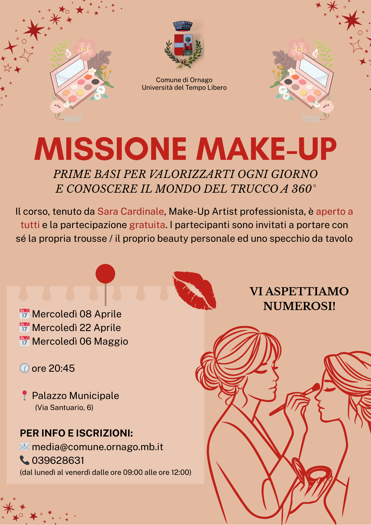 Il Comune di Ornago, in collaborazione con Sara Cardinale, Make-Up Artist professionista, organizza "Missione Make-Up", un progetto che nasce con l'obiettivo di offrire alla cittadinanza un percorso introduttivo e formativo dedicato alle basi del make-up, con particolare attenzione alla valorizzazione della persona nella quotidianità e alla conoscenza consapevole delle tecniche fondamentali del trucco.